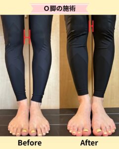 O脚の程度はもともと正常範囲内でしたが、太ももやふくらはぎの筋緊張、股関節の可動域制限が確認されました。